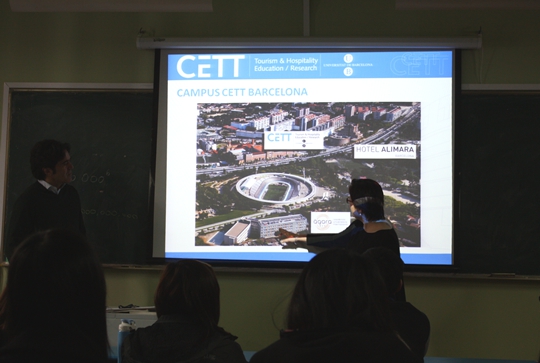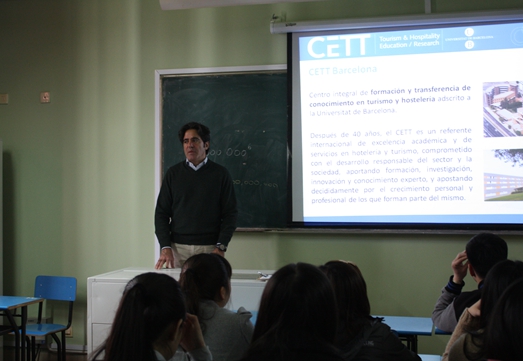 会上,来自西班牙巴塞罗那大学CETT旅游学院院长David和巴塞罗那自治大学的单老师用纯正的西语和热情的态度,吸引了同学们的注意力。主要介绍了有关于学校的官方硕士项目,专业包括:旅游企业的战略管理、酒店管理、会展管理、美食及厨艺遗产管理等。学院设有专升硕,另外也有其他专业、类别供学生们自由选择,毕业后,其学位受中国教育部认可。就业方向将呈现多元化趋势,并存在着巨大的潜在市场需求。在场的同学对这所大学充满了兴趣,师生之间形成良好的交流与互动。