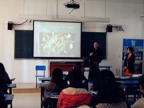 拉斐尔老师描述了西班牙的生态环境,城市构造和人文风情。他特别提到西班牙文化部为表彰杰出的西班牙语作家而设立的塞万提斯奖,每年在塞万提斯故乡的阿卡拉大学(Universidad de Alcalá)由西班牙国王亲自颁授,可说是西班牙语世界的文学最高荣誉。“如果有中国留学生能灵活运用西语写作,作品出色的话,也能够角逐塞万提斯奖。这是一个很大的动力。”拉斐尔老师打趣到。同时,他还提到阿尔卡拉大学,欧洲最古老的大学之一。联合国教科文组织于 1998 年将阿尔卡拉大学列入世界文化遗产,不仅仅是因为她是西班牙历史上伟大作家米格尔塞万提斯的故乡,还因为红衣主教西斯内罗( Cisneros )选择了在此建校,并成为拉丁美洲创建大学的榜样。几个世纪以来,大学一直享有世界性的声誉。