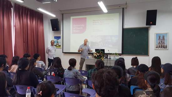 9月21日,英国公立南威尔士大学学生事务部主管Richard Stacey、国际部Sam Huang来访我校,走进课堂与师生互动交流。